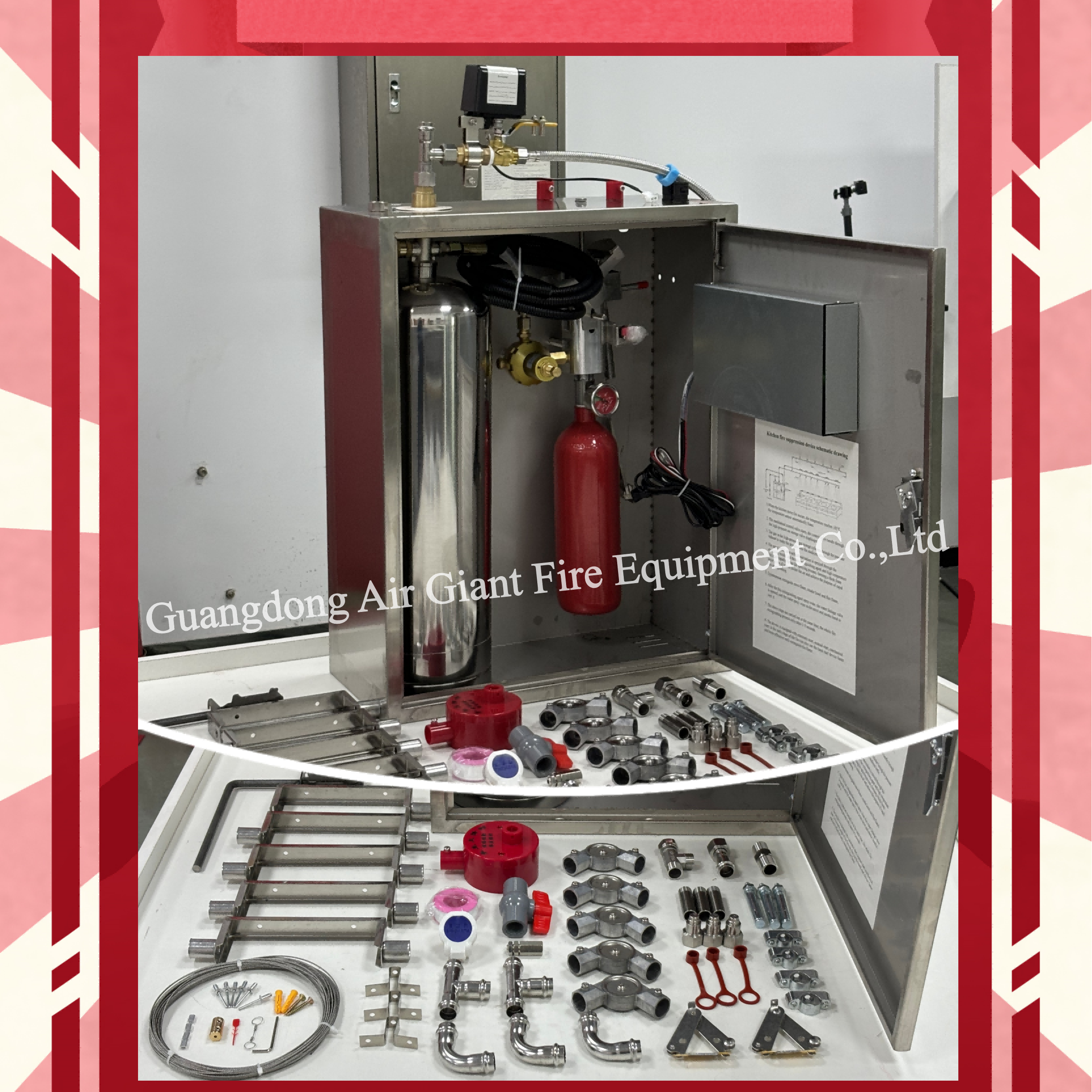5.नोजल/स्प्रे पाइप: उच्च जोखिम वाले अग्नि क्षेत्रों जैसे कि स्टोव के ऊपर स्थित आग के स्रोत पर दमनकारी पदार्थ के समान वितरण को सुनिश्चित करने के लिए टॉप और रेंज हुड।